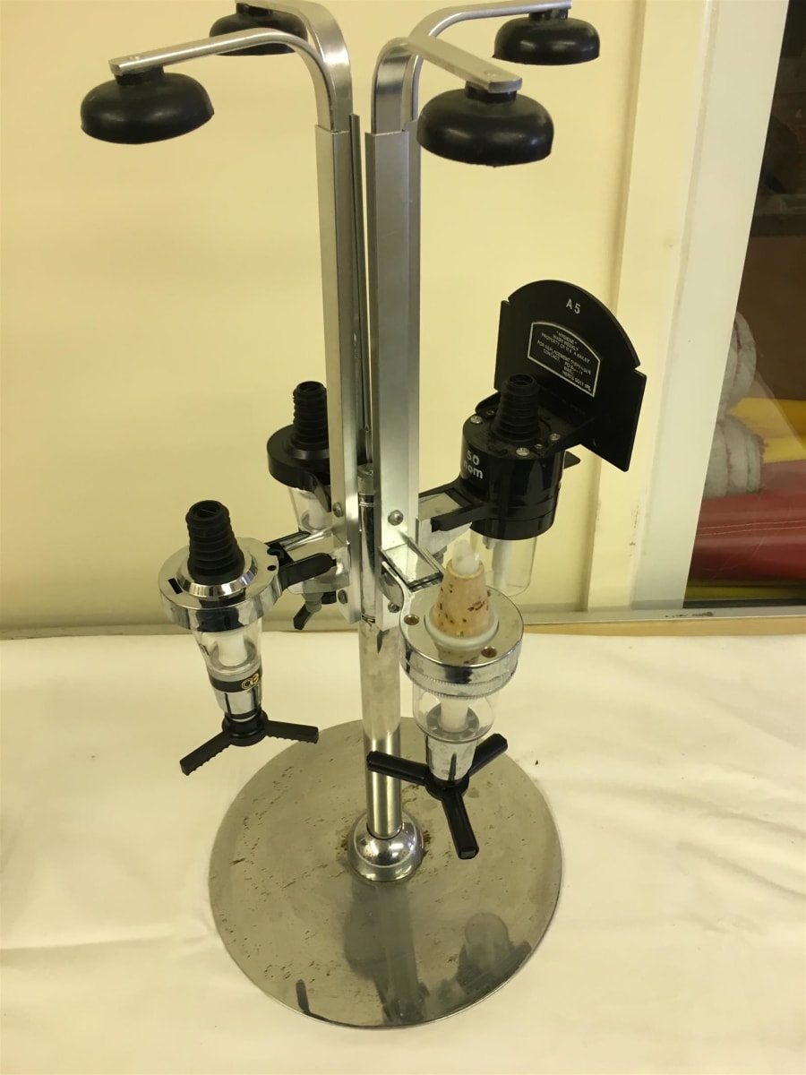 Optic Spirit holder can hold 4 bottles each one with a measured optic on the end.