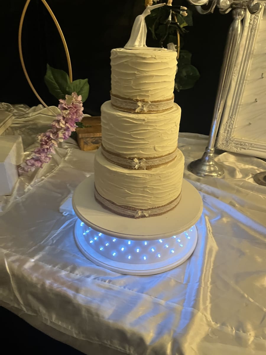 Make a statement at your next wedding or birthday party with our elegant White Round Cake Stand. This stunning cake stand not only adds a touch of sophistication to any event but also comes equipped with battery-controlled lights within the base, creating a captivating ambiance that will make your cake shine bright throughout the celebration.