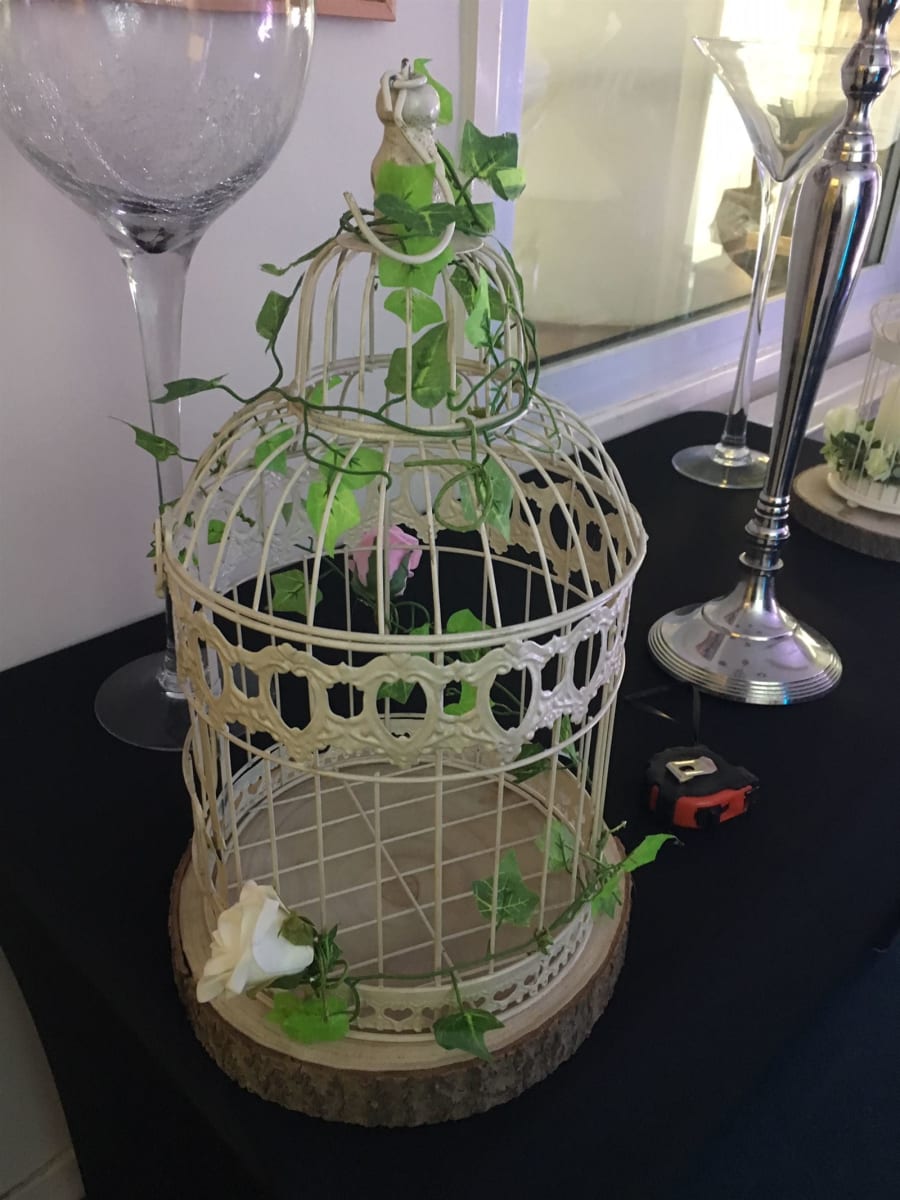 Ivory bird cage for hire, making great centrepieces comes with one leaf decoration.