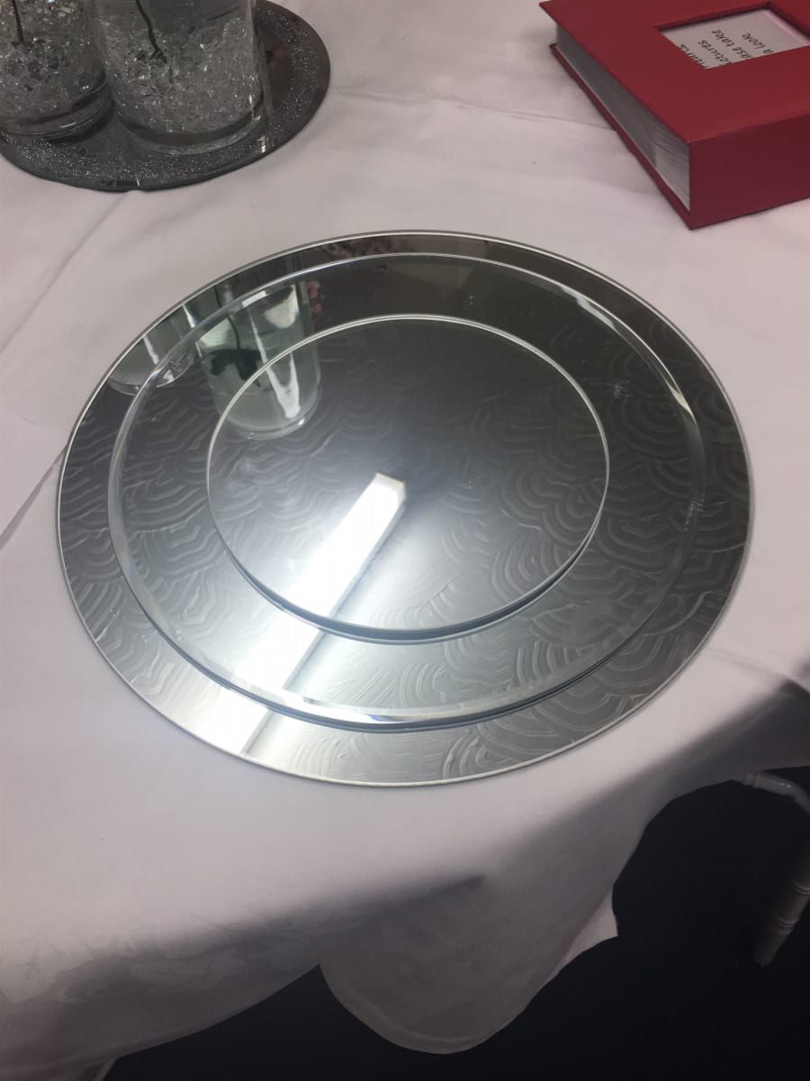 Mirror plate for hire. great for the centre of the table for your centrepiece to sit on.