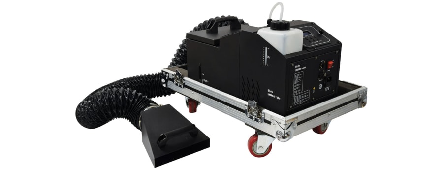 Stage effect machine producing "dry ice" type low fog effects without the use of carbon dioxide or ice. New technology delivers a ground-hugging mist from standard fog fluid and water. Housed in a flight case.