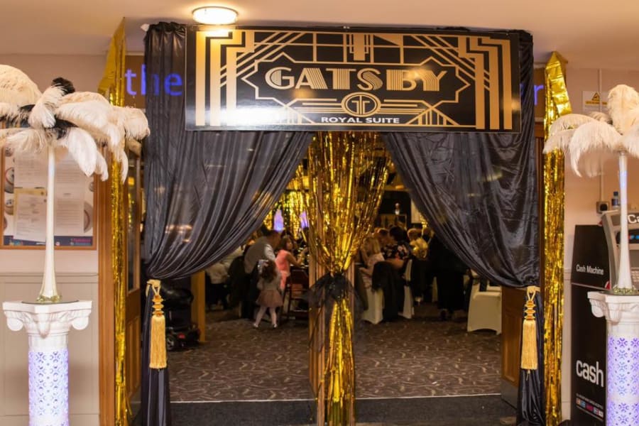 We have this lovely decades themed entrance for your event, make a statement at the start of your event, with this decades theme entrance with curtains which can be either red or black with gold tie backs.