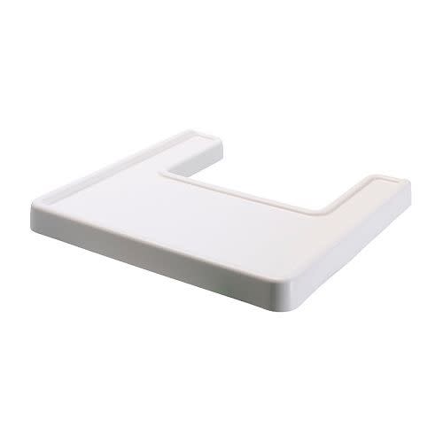 White plastic highchair with safety belt with front tray.