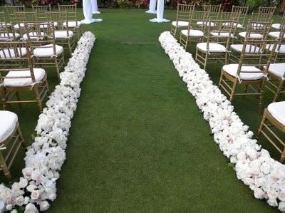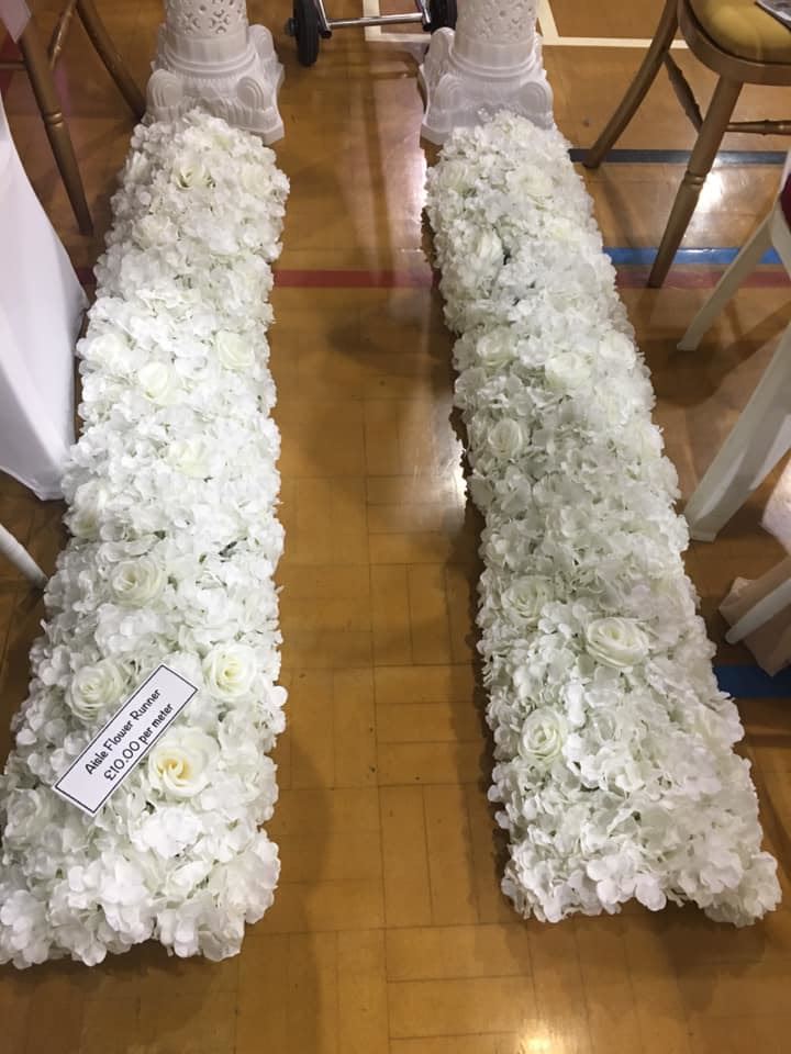 White curved Hydrangea Panel with Rose Heads look amazing running down each side of your aisle.
